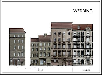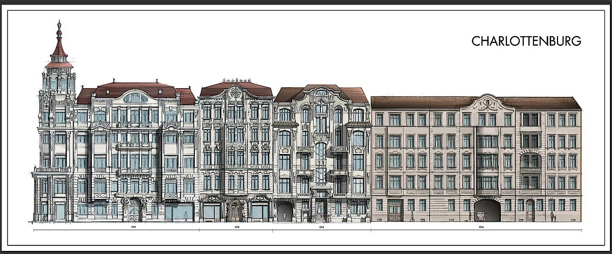 Hanisch: Wir haben mit Hunderten von Vorlagen gearbeitet und dann nach und nach alle Fassaden individuell entworfen. Das war notwendig, weil wir ja diesen Verlauf in den Entwürfen von ganz reich und elaboriert (unser Charlottenburg), über gemäßigt ausgestaltet (bei uns Kreuzberg) bis hin zu ganz einfach und abgewirtschaftet (der Wedding) durchformuliert haben.